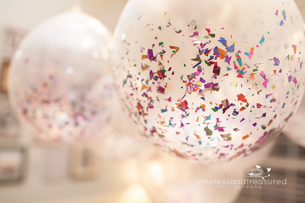 She even came up with this balloon idea from spending lots of time scouring Pinterest of course! We sat in the driveway one day putting handfuls of sparkly confetti inside deflated clear balloons. The day of the party we added a few drops of water and blew them up and the confetti clung to the sides perfectly! I was dreading one of them popping inside the house, but somehow not one of them did! AMAZING.